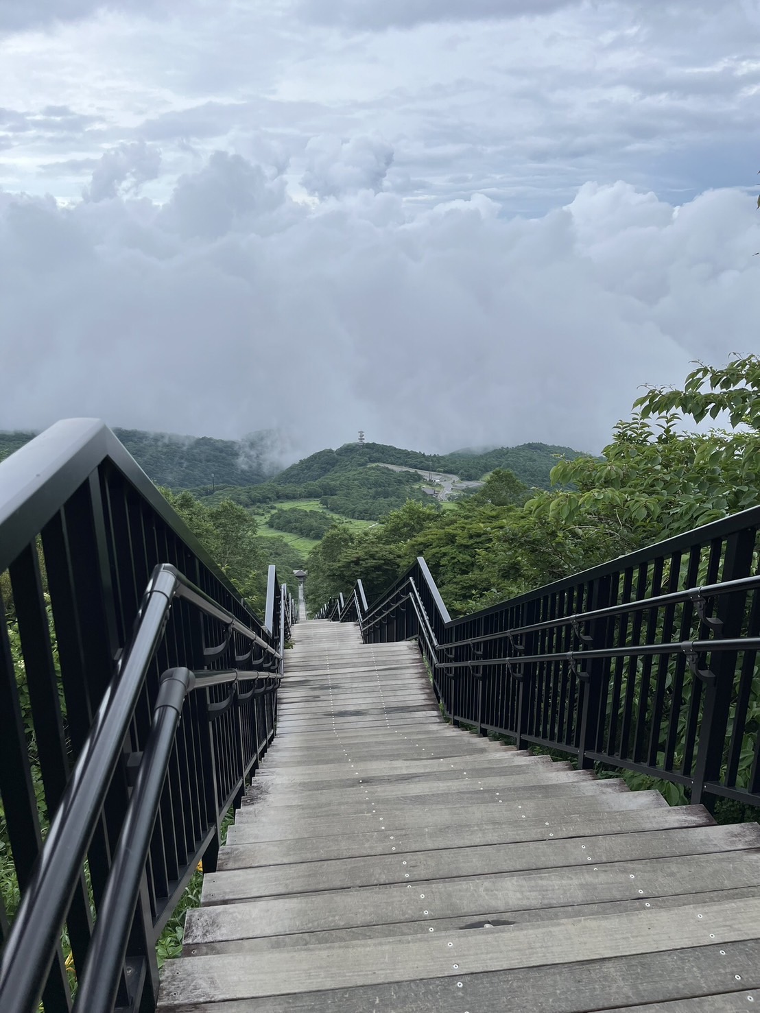 駐車場は霧が立ちこもり厳しい世界感で頂上までは1445段の階段地獄でした笑