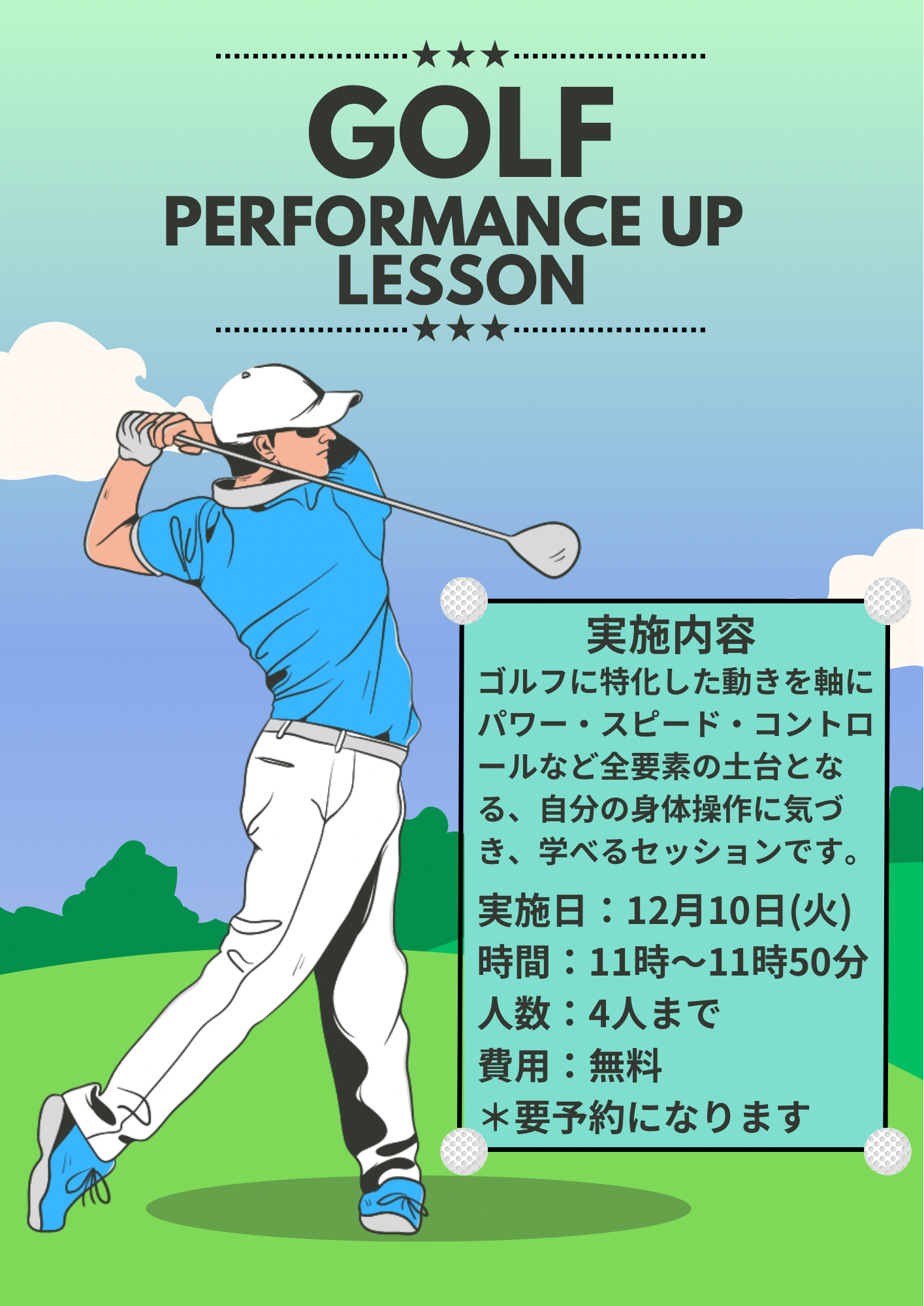 12月にゴルフのセルフコンディショニングレッスンを行うので
