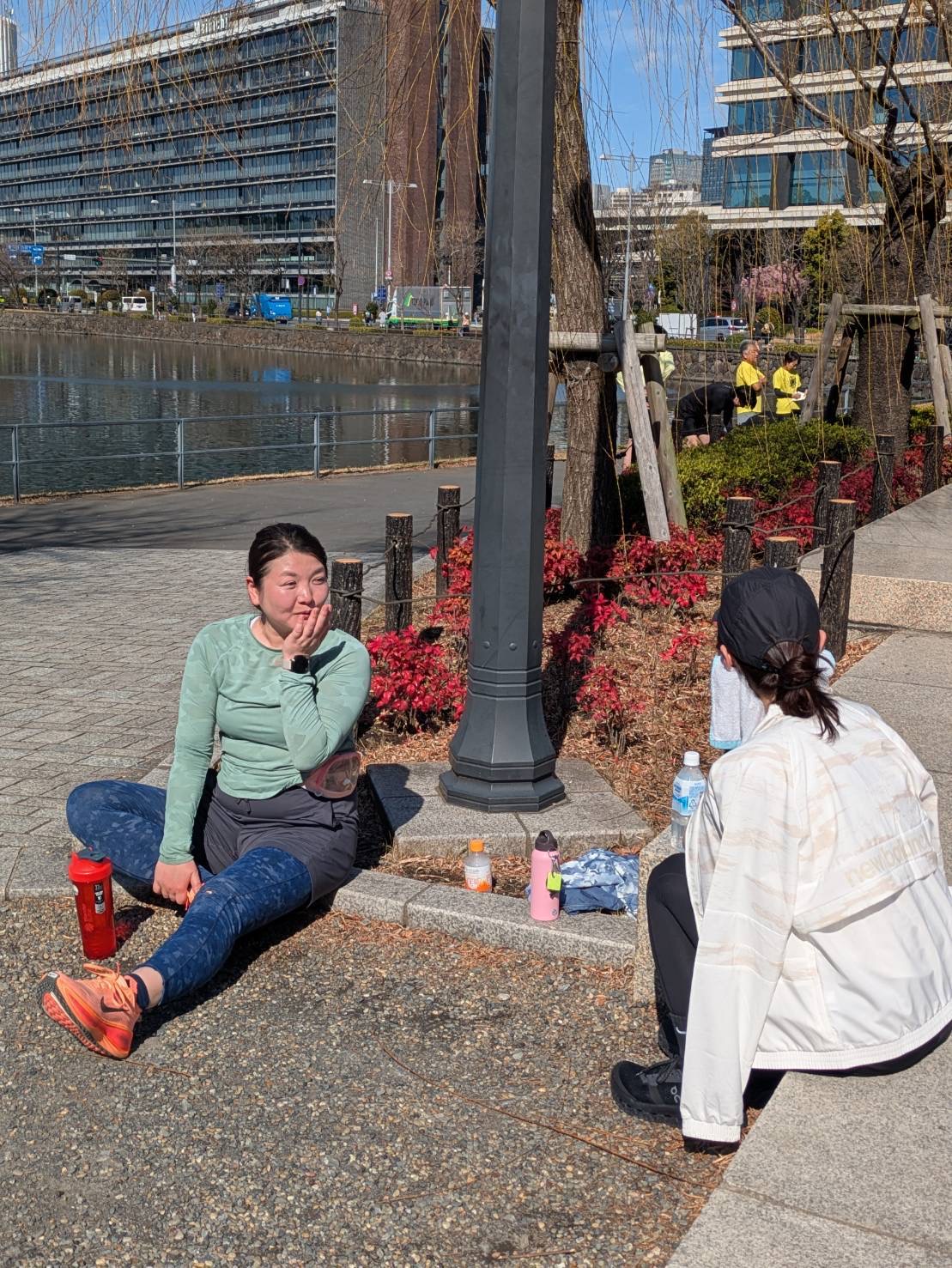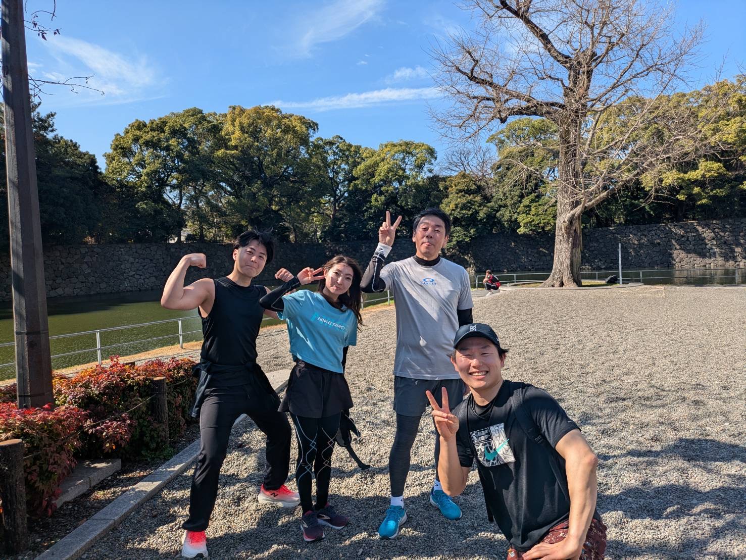 皇居の周りは一周で5kmあるので、その人のレベルに合わせて1〜2周、簡単なフォームチェックをしてあげながら楽しく走りました!!