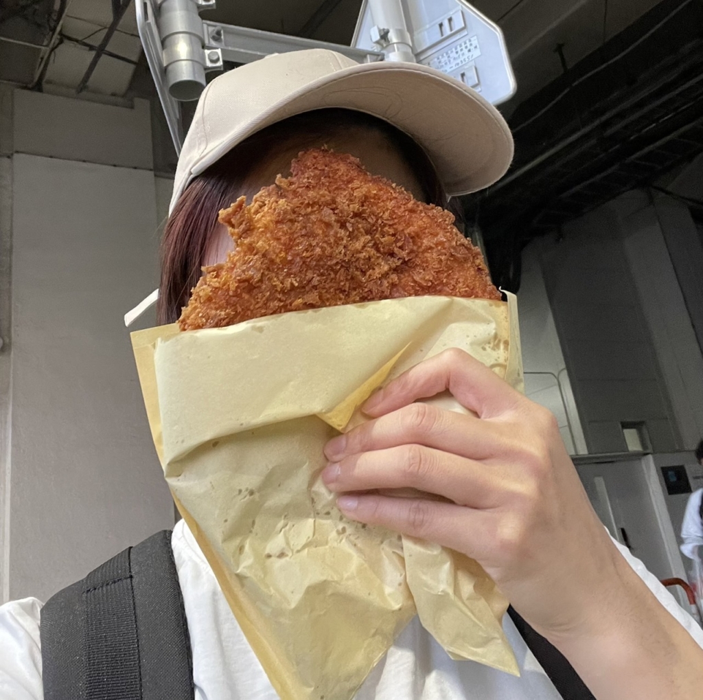↓旅の打ち合わせ時に近くの惣菜屋でみつけた私の顔より大きなファ〇チキ ¥180(税込)