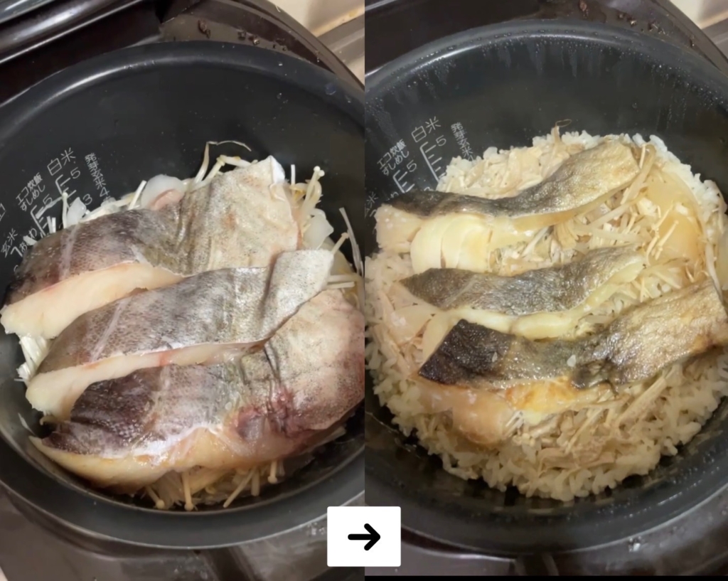 いつもその日の気分で材料や調味料は変えているのですが、この写真では玄米3合に、鱈、鶏胸肉、えのき、たまねぎ、白菜を入れて、白だしで味付けして炊飯しました!
