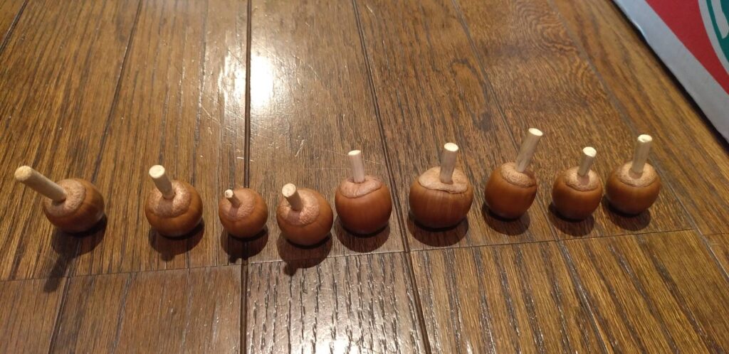 そこで今日は「どんぐり」です。普段拾って投げて終わり…なのですが、今年は「どんぐりコマ」を作ってみました。