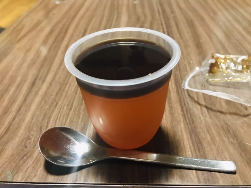 橙色の付いた無味の寒天に黒蜜をかけていただきます。