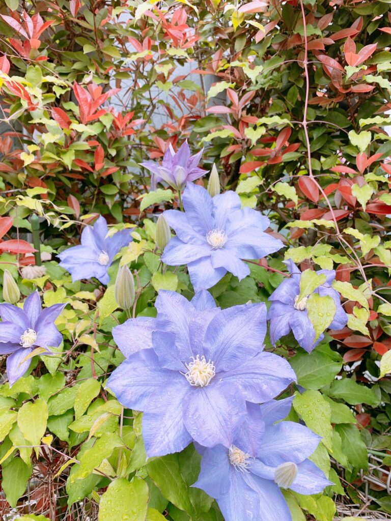 今、庭で1番存在感を示しているのはクレマチスです。これからキュウリを育てる予定の網を元気よく登りとても綺麗な花を咲かせています。