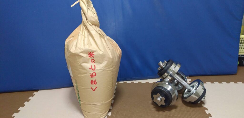 2ダンベルで約25㎏ですが、ダンベルの方が明らかに持ちやすいので軽く感じます。