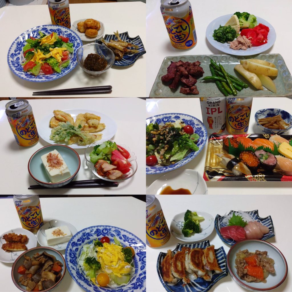 写真はここ1週間の夕食です。このおかずの後2本目のビールで乾き物。その後はコーヒーと甘い物でホッとするひとときを。。