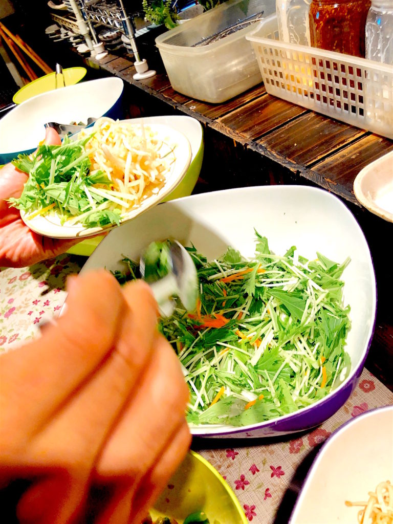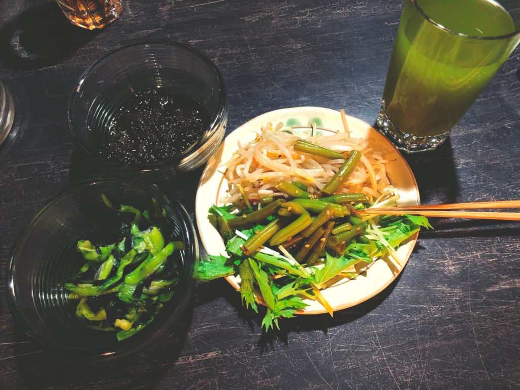 シャキシャキの生野菜だけでなく、切り干し大根や野菜の煮つけなどの和惣菜、もずくやひじきといった海藻類も登場します(内容は日によって変わります)。