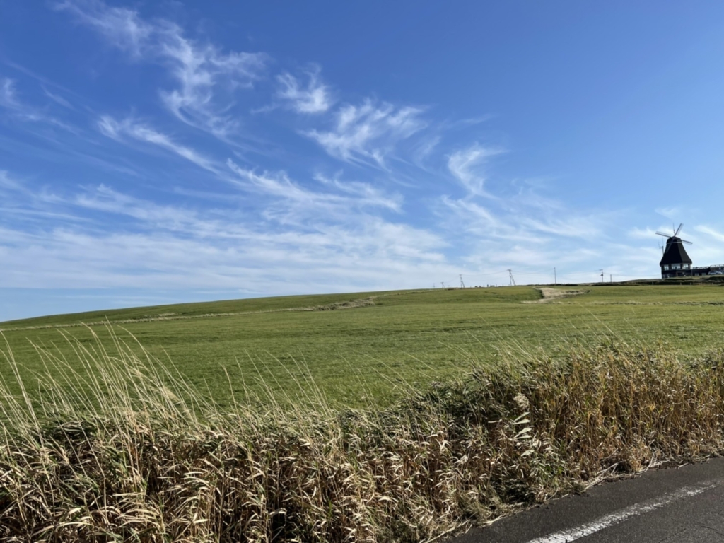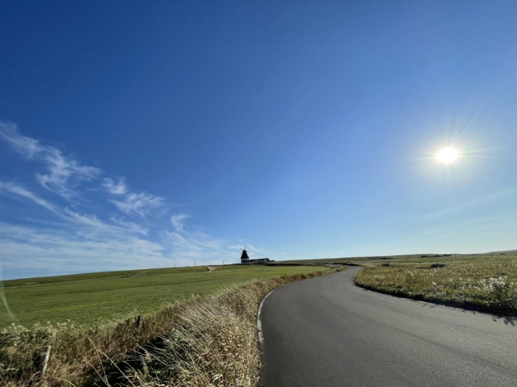 広い海と振り返る先には海の様に広い黄緑の一面に見上げた空は遮るものひとつなく正にパノラマ。
